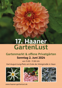 | 2 juni | Haaner GartenLust in Haan (DE) Park am Windhövel, Haan ![]() 13.00 – 17.00 uur | toegang: gratis www.haaner-gartenlust.de |